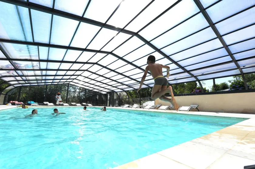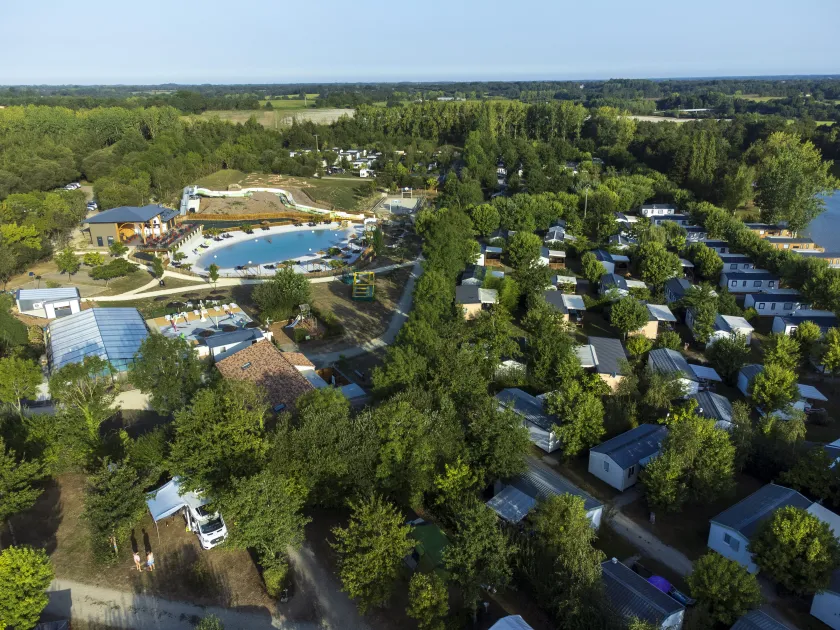Vooraan vind je het verzorgde, compacte deel van deze camping met zwem-, speel- en sportfaciliteiten, de snackbar, het sanitairgebouw en de toeristische staanplaatsen op gras, langs grindpaden door wat ruige struiken en bomen gescheiden. Daarachter komen de gegroepeerde stacaravans en huurtenten. Voor de kleinere kinderen is er een spray-park naast het verwarmde zwembad met schuifkap. Bij de super schone lagune met een fijn zandstrand zijn twee spectaculaire lange waterglijbanen.