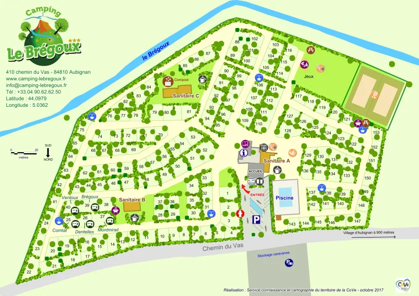 Camping du Brégoux ligt op loopafstand van Aubignan, 5 minuten van Carpentras en minder dan een half uur van Avignon, Orange, Vaison-la-Romaine en de Luberon. De staanplaatsen zijn voor het merendeel schaduwrijk en omheind door hoge heggen. De verhuuraccommodaties bestaan uit mobilhomes. De camping heeft een buitenzwembad en tennisbaan, jeu de boules baan en tafeltennistafels. Ook zijn er gemeenschappelijke barbecue plaatsen. Camping du Brégoux is een goed uitgangspunt voor wandel- en fietstochten naar de Mont Ventoux. Fietsen zijn te huur op de camping.