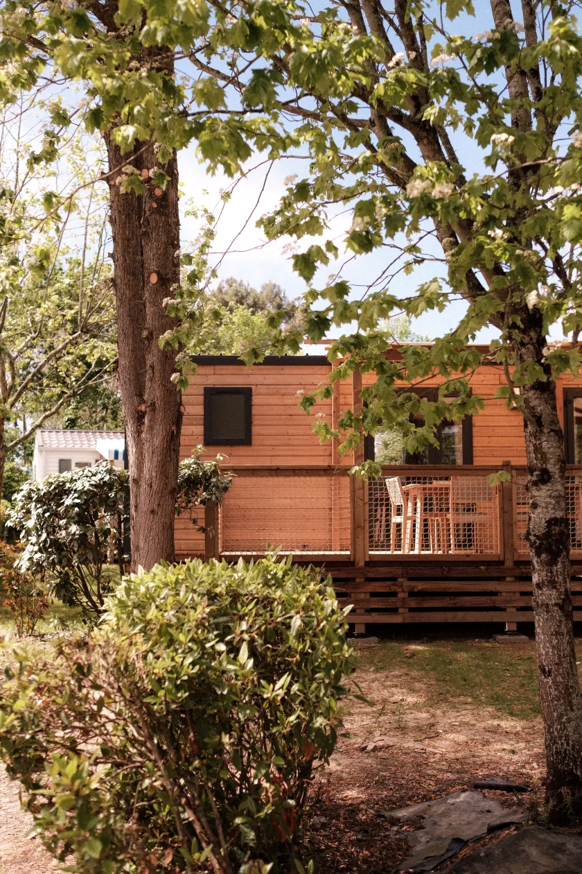 Camping L'Orée de l'Océan biedt verhuur van luxe stacaravans/chalets, ingerichte tenten .