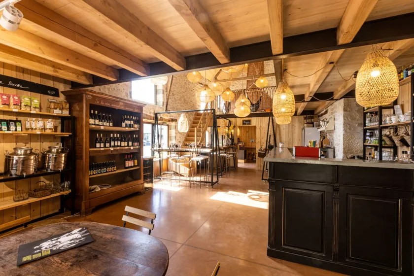 Bij de ingang van de camping de wijnbar "Chez Sophie", een kruidenierswinkel, de receptie en een wellnessruimte in een gerestaureerde schuur. Geniet van een gezellig moment, een landelijke en gezellige plek vol mooie verrassingen en goede producten.