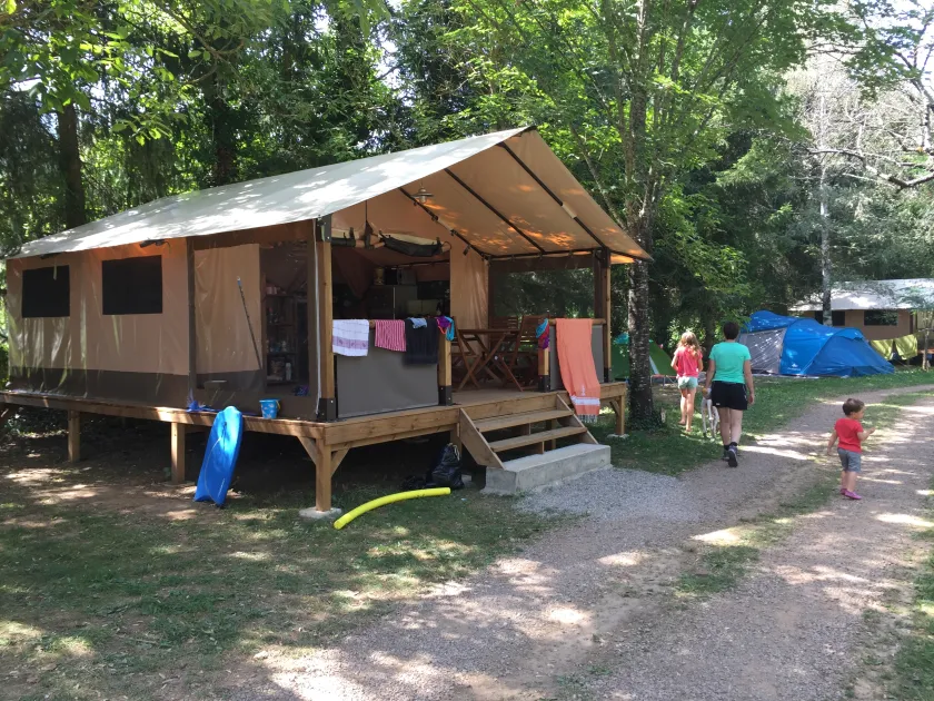 Camping Les Cerisiers biedt verhuur van luxe stacaravans/chalets, ingerichte tenten .