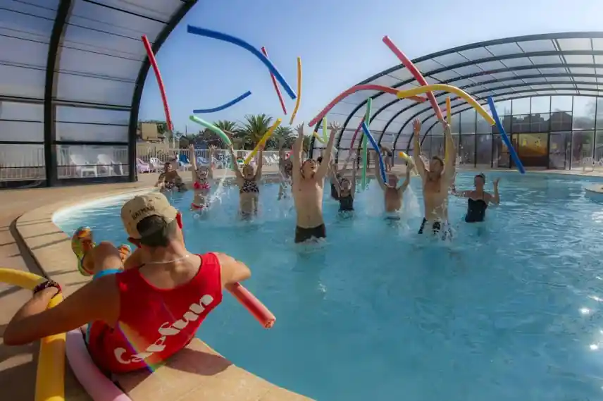 De camping heeft een zwemgedeelte met 1 verwarmd en overdekt zwembad en glijbanen!