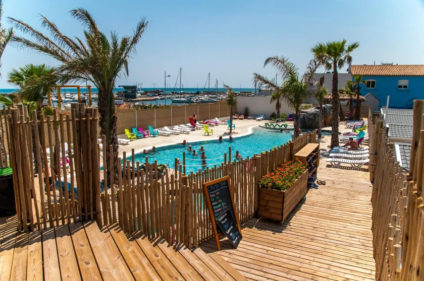 Het zwembad van de camping is een ware oase in tropische sfeer, compleet met palmbomen en rotsen. Je vindt hier een groot verwarmd zwembad dat is vormgegeven als een natuurlijke lagune, inclusief een waterval en massagestralen. Voor de kinderen is er een veilig ondiep gedeelte waar ze heerlijk kunnen spelen. Het zwemcomplex biedt een fijne afwisseling met de zee, vooral voor wie van zoet water en comfort houdt. Rondom het bad is een ruim zonneterras aangelegd met talrijke ligstoelen, waar je in de schaduw van een parasol of vol in de zon kunt relaxen.